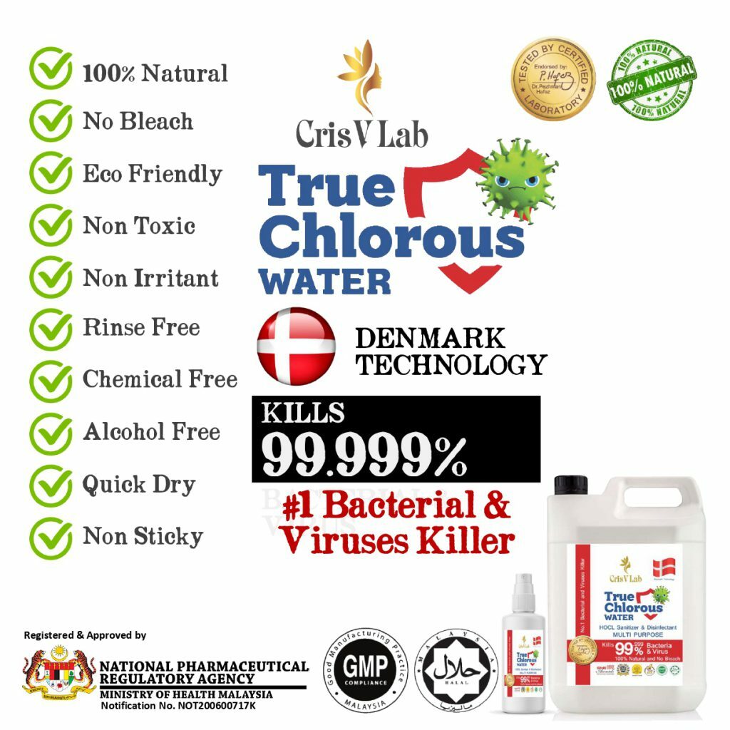 True Chlorous Water is for disinfection of exposed body parts, skin & all surfaces in risk of contamination. It is 100% Non-Toxic, contains No Alcohol, No Steroids and No Antibiotics. True Chlorous Water is safe to use around the eyes, ears, nose and mouth. It is 100% Biodegradable and Eco-Friendly.